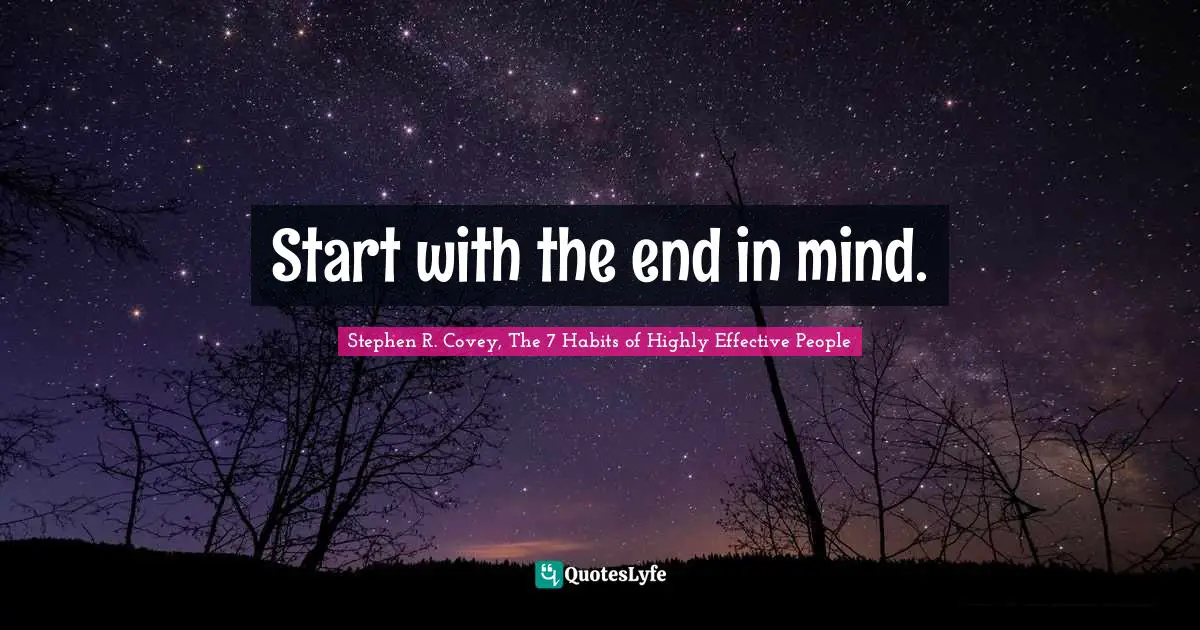 Think before you act That is especially true in this case where that act is your life. Begin with the End in Mind means to begin each day task or project with a clear vision of your desired direction and destination and then continue by flexing your proactive muscles to make things happen. Begin With the End in Mind means to start with a clear understanding of your destination. Begin With The End In Mind Hindi - Stephen Covey - Habit 2 Chapter Summary - YouTube. It means to know where youre going so that you better understand where you are now and so that the steps you take are always in the right direction. - Stephen Covey. It asks that you start everything you do. To begin with the end in mind is the second of the seven habits that New York Times bestselling author Dr. Think before you act That is especially true in this case where that act is your life.